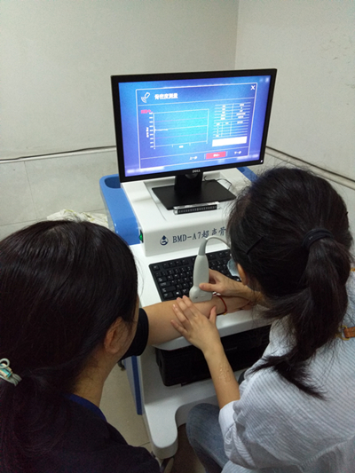 超聲骨密度測量系統(tǒng)是超聲診斷學范疇中的一項專門技術, 主要利用骨質(zhì)對超聲衰減度和聲速的變化來進行無創(chuàng)、無損、無輻射檢測人體骨密度、骨強度等生理學參數(shù), 對兒童生理發(fā)育,成人骨損、骨折風險的預防有很大的參考價值和指導價值, 為骨質(zhì)疏松疾病提供一種先進的診斷手段。該法操作簡便、安全無害、價格便宜、所用的儀器為兒童骨密度儀,和做B超一樣抹一點耦合劑,之后就有一個手柄式探頭對準骨頭部位進行掃描即可,大約需要35分鐘。