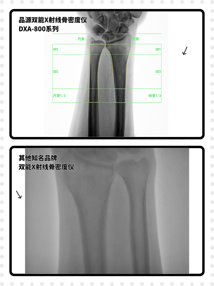 針對(duì)臨床常見的前臂骨密度檢測(cè)場(chǎng)景,雙能X射線骨密度儀DXA-800E特別搭載非均勻性校正(NUC)算法,專門對(duì)前臂圖像進(jìn)行優(yōu)化處理。