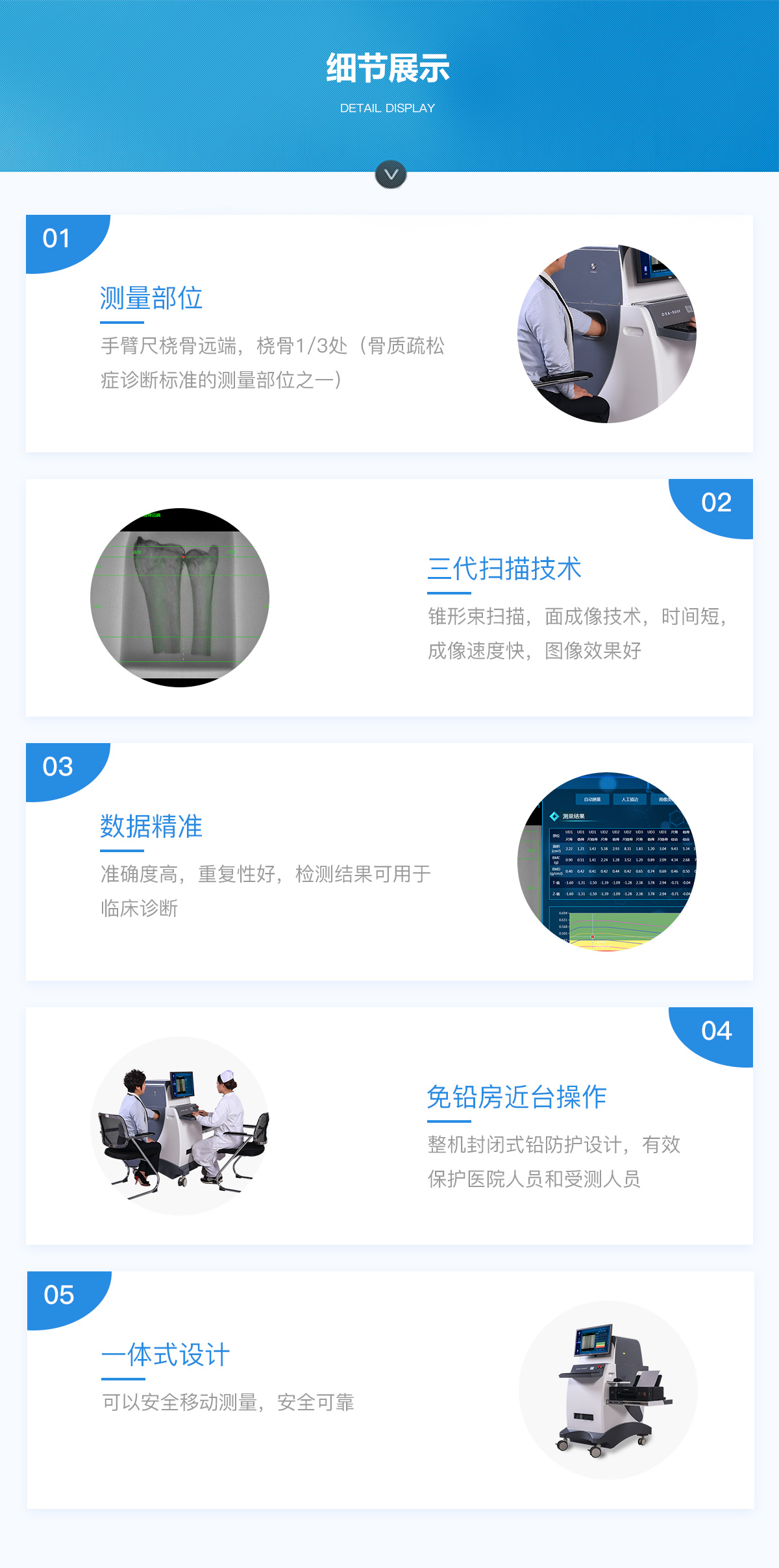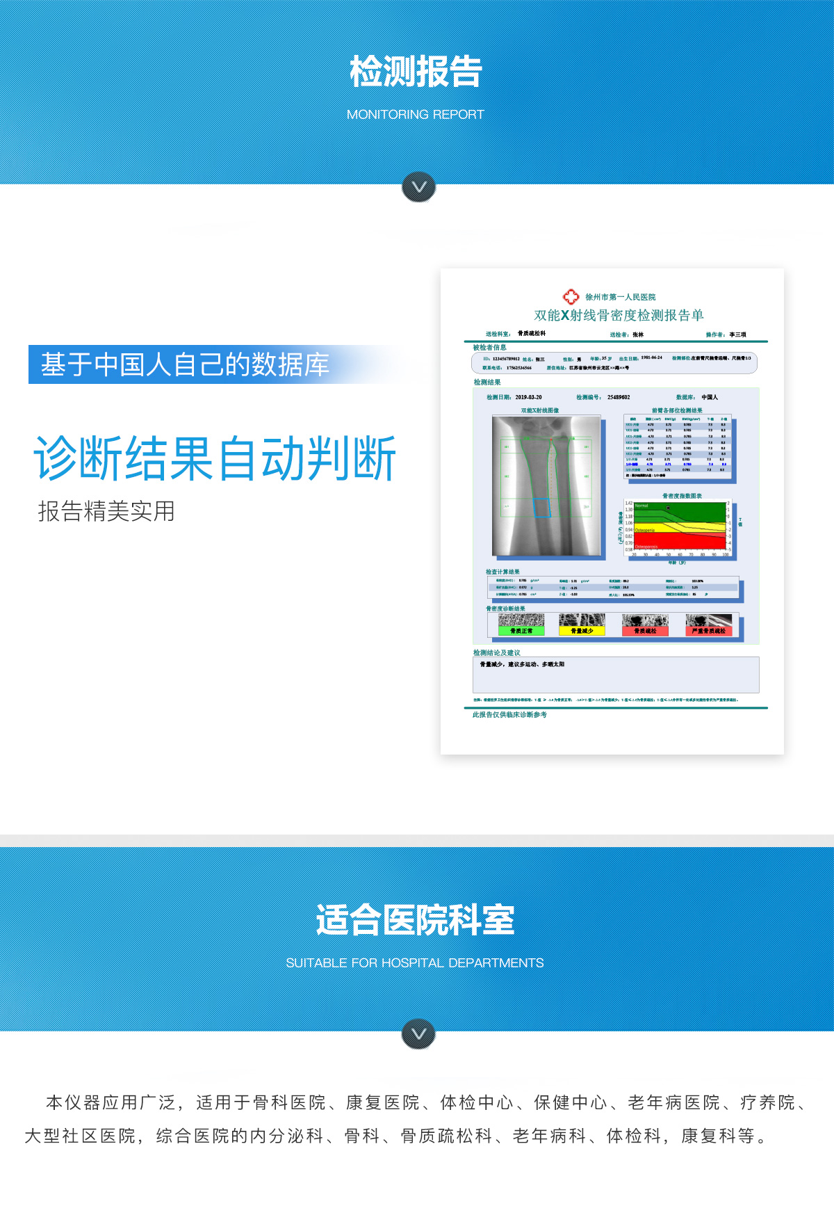 產(chǎn)品用途:本儀器應用廣泛,適用于骨科醫(yī)院、康復醫(yī)院、體檢中心、保健中心、老年病醫(yī)院、療養(yǎng)院、大型社區(qū)醫(yī)院,綜合醫(yī)院的內(nèi)分泌科、骨科、骨質(zhì)疏松科、老年病科、體檢科,康復科等。